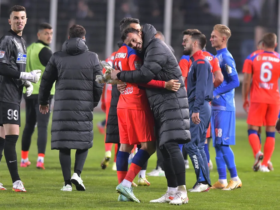Andrei Daniel Vlad si Catalin George Straton il felicita pe Constantin Valentin Budescu dupa meciul de fotbal dintre Chindia Targoviste si FCSB, contand pentru Liga 1 Casa Pariurilor, desfasurat pe Stadionul Ilie Oana din Ploiesti, vineri 1 octombrie 2021. © FOTO:Razvan Pasarica/SPORT PICTURES
