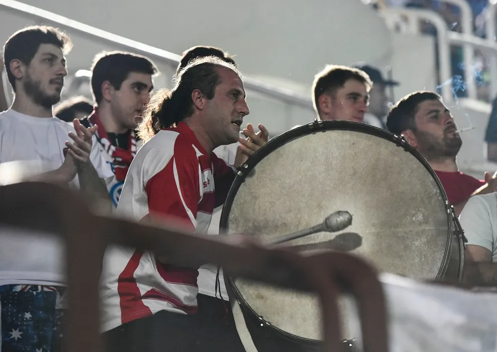 5975979 14.08.2019 Fans cheering during a Qualification Europa League soccer match between Saburtalo Tbilisi and FC Ararat-Armenia, in Tbilisi, Georgia.,Image: 465359632, License: Rights-managed, Restrictions: Editors' note: THIS IMAGE IS PROVIDED BY RUSSIAN STATE-OWNED AGENCY SPUTNIK., Model Release: no, Credit line: Profimedia