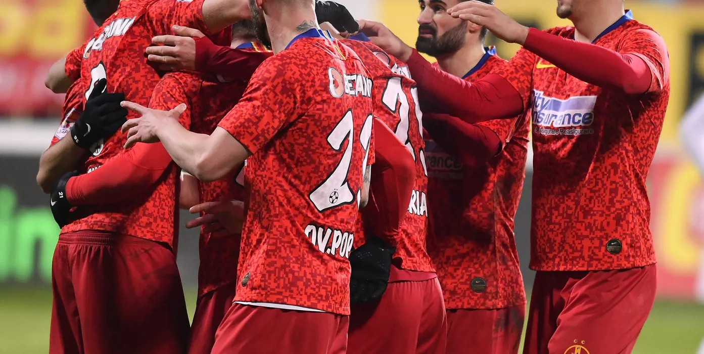Bucurie a fotbalistilor stelisti cu Sergiu Florin Bus, Ionut Daniel Vina si Andrei George Miron dupa un gol marcat in meciul de fotbal dintre Gaz Metan Medias si FCSB, contand pentru Liga 1 Casa Pariurilor, desfasurat fara spectatori pe Stadionul Municipal din Medias, luni 23 noiembrie 2020. © FOTO:Razvan Pasarica/SPORT PICTURES
