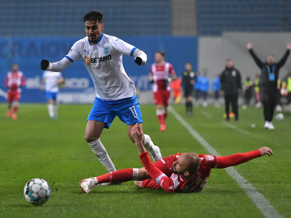Stefan Baiaram si Ante Puljic in meciul de fotbal dintre Universitatea Craiova si Dinamo Bucuresti, contand pentru Liga 1 Casa Pariurilor, desfasurat fara spectatori pe Stadionul Ion Oblemenco din Craiova, sambata 6 februarie 2021. © FOTO:Razvan Pasarica/SPORT PICTURES