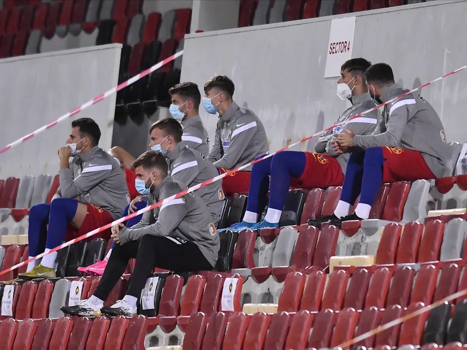Rezervele steliste in tribuna la meciul de fotbal dintre FCSB si Slovan Liberec, contand pentru Liga Europa, desfasurat fara spectatori pe Stadionul Marin Anastasovici din Giurgiu, miercuri 24 septembrie 2020. © FOTO:Razvan Pasarica/SPORT PICTURES