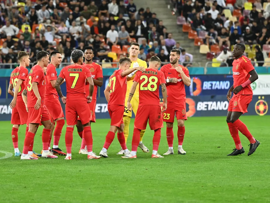 Fotbalistii stelisti Octavian George Popescu,Risto Radunovic,Adrian Gheorghe Sut, Siyabonga Ngezana, Darius Dumitru Olaru, Stefan Tarnovanu,Ovidiu Marian Popescu si Joyskim Aurelien Dawa Tchakonte la startul meciului de fotbal dintre FCSB si Universitatea Cluj, din cadrul Superligii Superbet, desfasurat pe Arena Nationala din Bucuresti, luni 2 octombrie 2023. © FOTO:Razvan Pasarica/SPORT PICTURES
