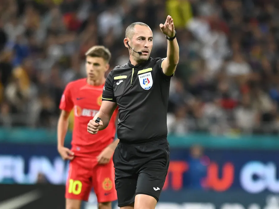 Arbitrul central Ionut Coza reactioneaza in meciul de fotbal dintre FCSB si Universitatea Cluj, din cadrul Superligii Superbet, desfasurat pe Arena Nationala din Bucuresti, luni 2 octombrie 2023. © FOTO:Razvan Pasarica/SPORT PICTURES
