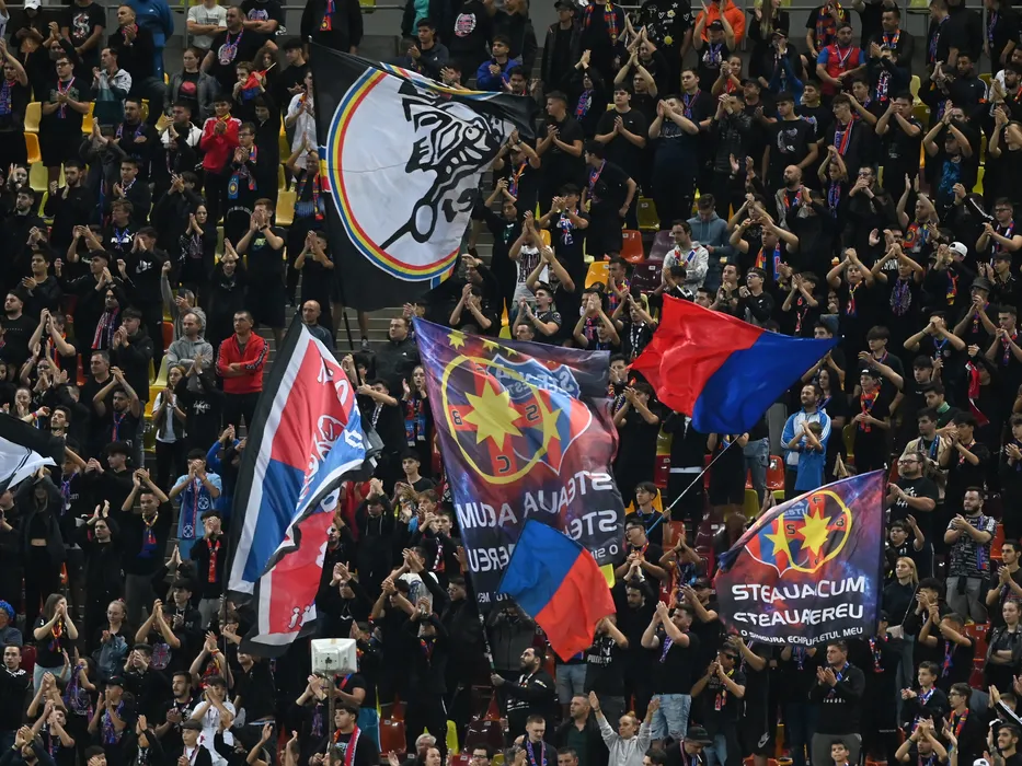 Galeria stelista cu steaguri fluturate in peluza la meciul de fotbal dintre FCSB si Universitatea Cluj, din cadrul Superligii Superbet, desfasurat pe Arena Nationala din Bucuresti, luni 2 octombrie 2023. © FOTO:Razvan Pasarica/SPORT PICTURES