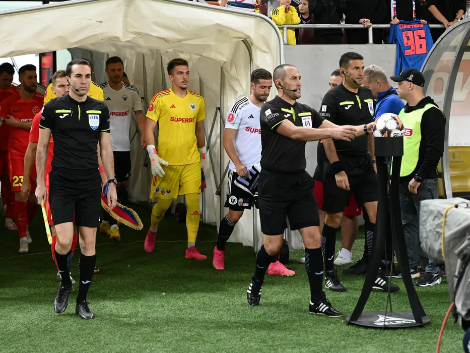 Brigada de arbitrii formata din Mihai Marius Marica, Ionut Coza si Vladimir Urzica alaturi de capitanii Darius Dumitru Olaru si Mihaita Alexandru Chipciu si portarul clujean Andrei Cristian Gorcea la meciul de fotbal dintre FCSB si Universitatea Cluj, din cadrul Superligii Superbet, desfasurat pe Arena Nationala din Bucuresti, luni 2 octombrie 2023. © FOTO:Razvan Pasarica/SPORT PICTURES