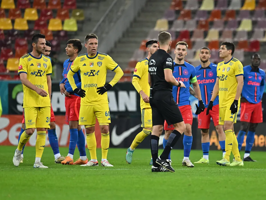 Arbitrul central George Catalin Roman discută cu Florin Flavius Purece, Dmytro Pospielov, Darius Dumitru Olaru si Marius Paul Antoche in meciul de fotbal dintre FCSB si Unirea Slobozia, din cadrul Superligii Superbet, desfasurat pe Arena Nationala din Bucuresti, duminica 24 noiembrie 2024. © FOTO:Razvan Pasarica/SPORT PICTURES