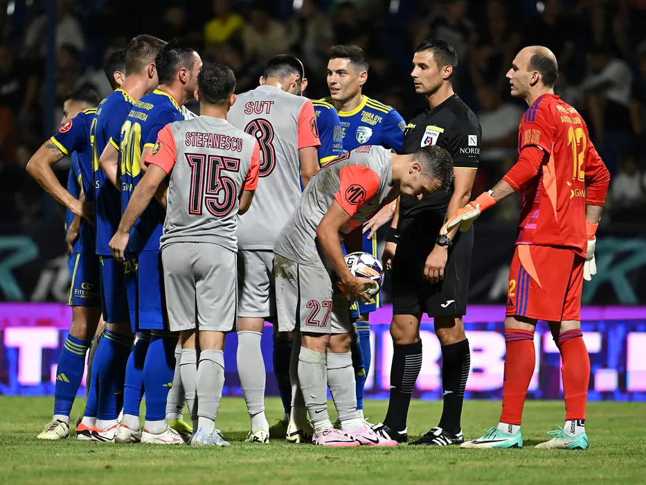 Darius Dumitru Olaru se pregateste sa execute un penalty sub privirile lui Marius Paul Antoche, Denis Rusu si arbitrului central Vlad Baban in meciul dintre Unirea Slobozia si FCSB, contand pentru Superliga Superbet, desfasurat pe Clinceni Arena din Clinceni, vineri 19 iulie 2024. © FOTO:Razvan Pasarica/SPORT PICTURES