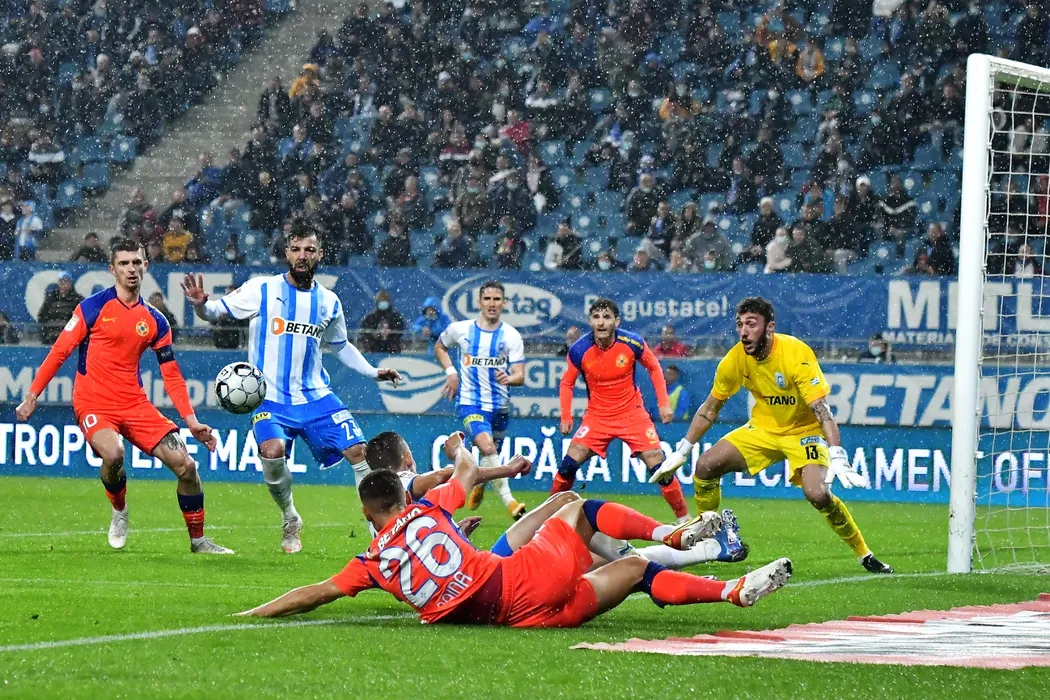 Portarul Mirko Pigliacelli (D), de la Universitatea Craiova, apara poarta in timpul meciului de fotbal contra echipei FCSB din etapa a XVII-a a Ligii 1, disputat pe stadionul Ion Oblemenco din Craiova, duminica, 28 noiembrie 2021. REMUS BADEA / MEDIAFAX FOTO