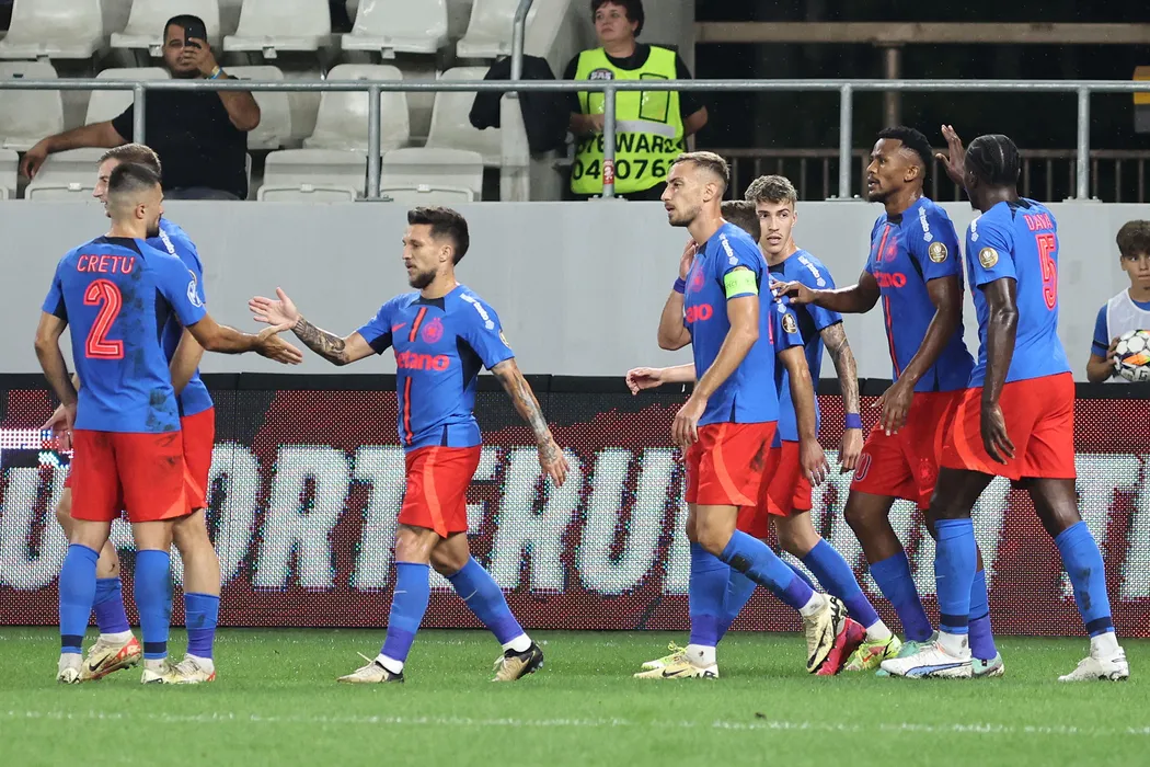 Fotbaliștii steliști se bucură după un gol marcat în meciul de fotbal dintre FCSB și UTA Arad, contând pentru Superliga Superbet, desfășurat pe Stadionul Arcul de Triumf din București, duminică 1 septembrie 2024. © FOTO: Gică FLUȘTER/SPORT PICTURES