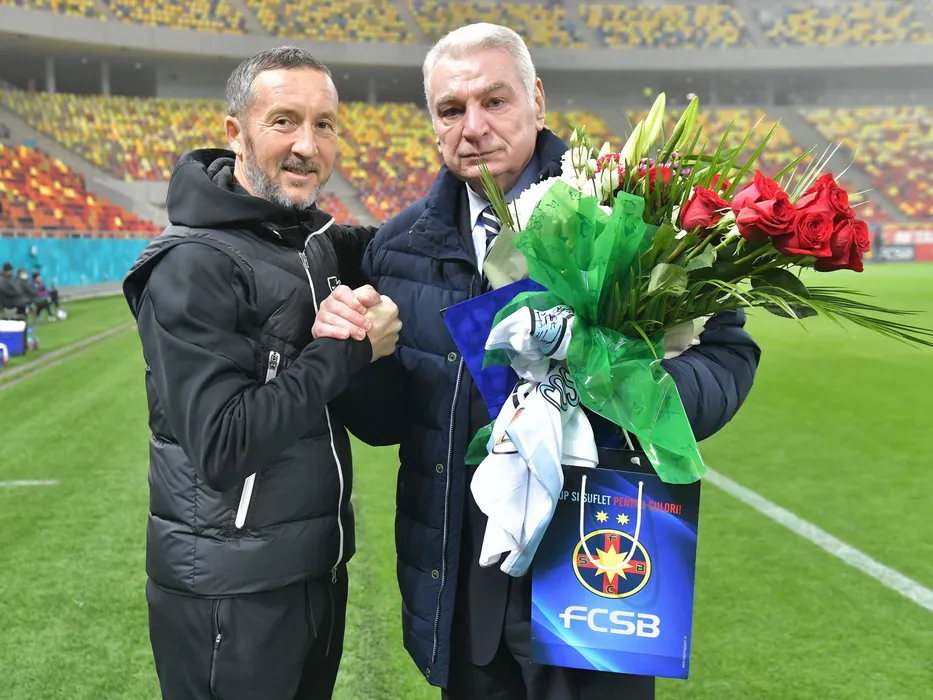 Mihai Stoica il felicita pe Gheorghe Constantin, zis si Costica Valcea, cu ocazia ultimei partide in calitate de observator la meciul de fotbal dintre FCSB si UTA Arad, contand pentru Liga 1 Casa Pariurilor, desfasurat pe Arena Nationala din Bucuresti, duminica 5 decembrie 2021. © FOTO:Razvan Pasarica/SPORT PICTURES