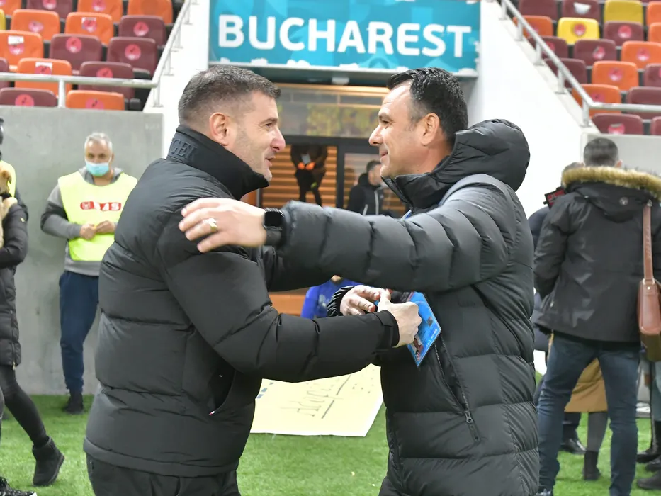 Cei doi antrenori Laszlo Gyorgy Balint si Toni Petrea se saluta inaintea meciului de fotbal dintre FCSB si UTA Arad, contand pentru Liga 1 Casa Pariurilor, desfasurat pe Arena Nationala din Bucuresti, duminica 5 decembrie 2021. © FOTO:Razvan Pasarica/SPORT PICTURES
