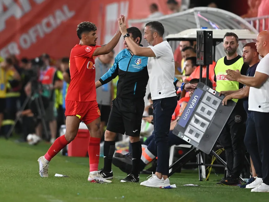 Mihai Stoica il felicita pe Florinel Teodor Coman la iesire de pe teren din meciul de fotbal dintre FCSB si Dinamo Bucuresti, din cadrul Superligii Superbet, desfasurat pe Stadionul National Arcul de Triumf din Bucuresti, sambata 22 iulie 2023. © FOTO:Razvan Pasarica/SPORT PICTURES