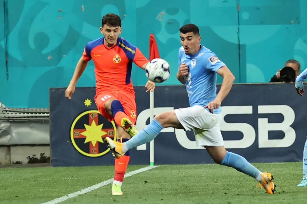 Marius Briceag (D), de la FC Voluntari, lupta pentru balon cu Ianis Stoica (S), de la FCSB, in meciul de fotbal din etapa a 4-a a play-off-ului Ligii 1, disputat pe Arena Nationala din Bucuresti, luni, 11 aprilie 2022. GEORGE FILIP / MEDIAFAX FOTO