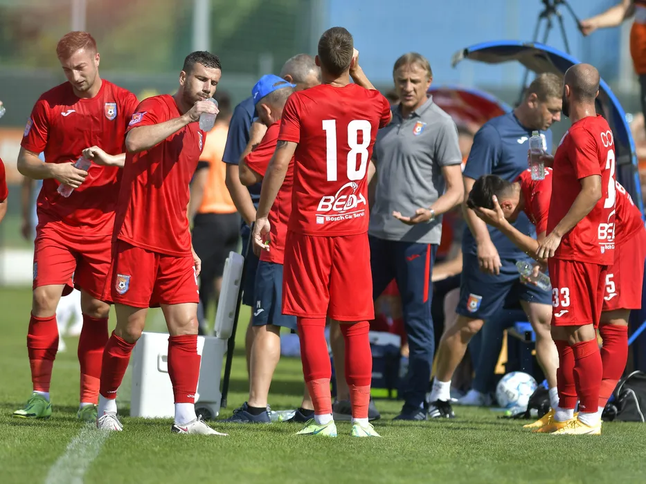 Fotbalistii targovisteni Iliuta Daniel Popa si Cornel Dinu la o pauza de hidratare in meciul amical de fotbal dintre FCSB si Chindia Targoviste, disputat la Baza de antrenament FCSB din Bucuresti-Berceni, sambata 3 iulie 2021. © FOTO:Razvan Pasarica/SPORT PICTURES