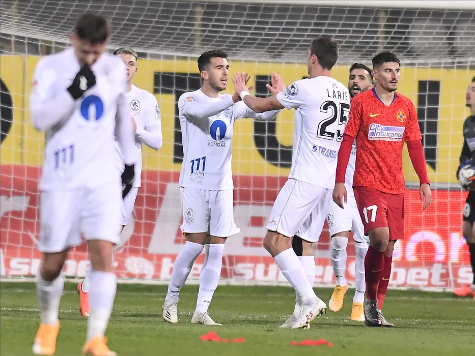 Octavian Ronaldo Andrei Deaconu este felicitat dupa un gol marcat in meciul de fotbal dintre Gaz Metan Medias si FCSB, contand pentru Liga 1 Casa Pariurilor, desfasurat fara spectatori pe Stadionul Municipal din Medias, luni 23 noiembrie 2020. © FOTO:Razvan Pasarica/SPORT PICTURES