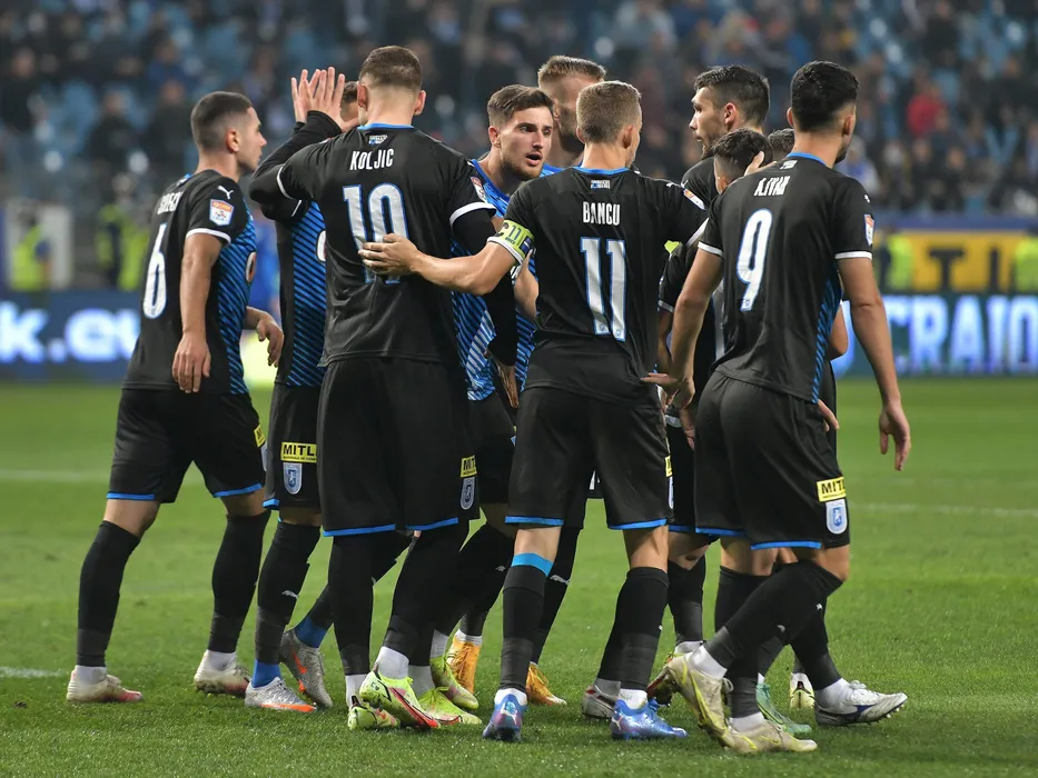 Mihai Cristian Capatina si Valerica Marius Gaman se bucura dupa un gol in meciul de fotbal dintre FC U Craiova si Universitatea Craiova, contand pentru Liga 1 Casa Pariurilor, desfasurat pe Stadionul Ion Oblemenco din Craiova, duminica 3 octombrie 2021. © FOTO:Razvan Pasarica/SPORT PICTURES