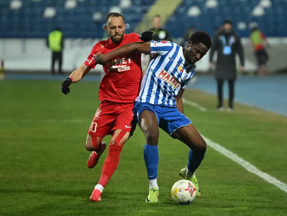 Mohammed Umar si Cristian Daniel Negut in meciul de fotbal dintre Poli Iasi si AFC Hermannstadt Sibiu, contand pentru baraj Cupa Romaniei Betano, desfasurat pe Stadionul Emil Alexandrescu din Iasi, miercuri 26 februarie 2025. © FOTO: Tudy/SPORT PICTURES