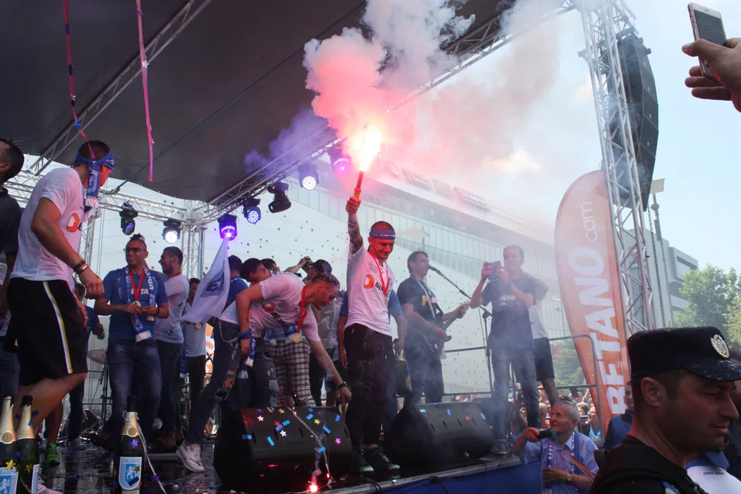 Fiesta în Bănie! Zece mii de olteni și-au sărbătorit eroii în centrul orașului. „Leii” lui Mangia au defilat cu un autocar descoperit și au prezentat cupa. Bancu, Mitriță și Băluță, „vinovați” pentru că evenimentul a fost devansat