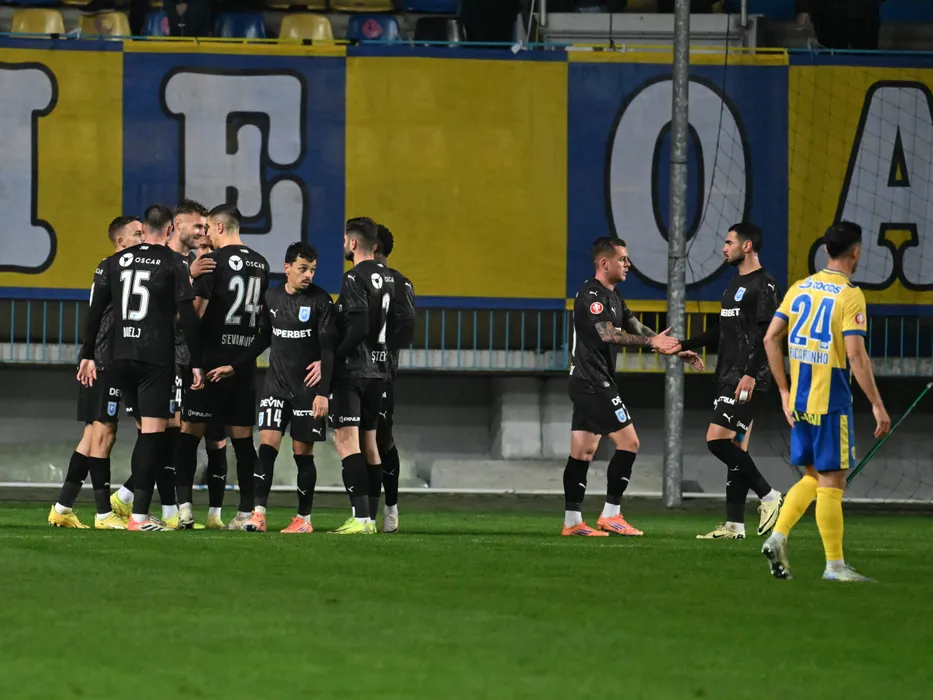 Bucurie a fotbalistilor craioveni Nicusor Silviu Bancu, Alexandru Cretu, Nikola Stefanovic, Lyes Hafid Houri, Florin Bogdan Stefan, Alexandru Cicaldau si Screciu Vladimir Ionuț dupa un gol marcat in meciul dintre Petrolul Ploiesti si Universitatea Craiova, contand pentru Cupa Romaniei Betano, desfasurat pe Stadionul Ilie Oana din Ploiesti, joi 4 decembrie 2025. © FOTO:Razvan Pasarica/SPORT PICTURES
