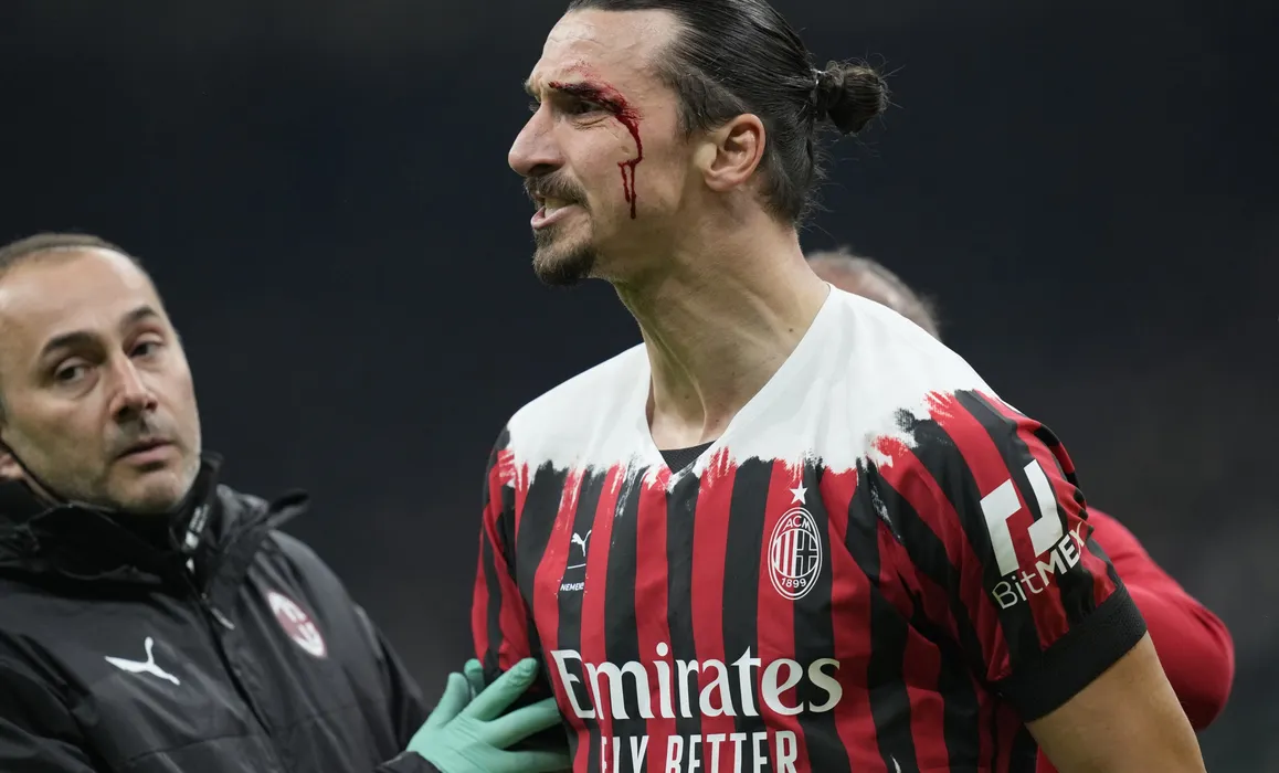 AC Milan's Zlatan Ibrahimovic reacts being injured from a header during the Serie A soccer match between AC Milan and Bologna at the San Siro stadium, in Milan, Italy, Monday, April 4, 2022. (AP Photo/Antonio Calanni)