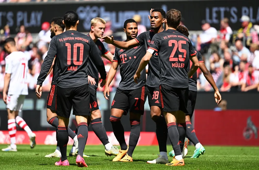 27 May 2023, North Rhine-Westphalia, Cologne: Soccer: Bundesliga, 1. FC Köln - Bayern München, Matchday 34, RheinEnergieStadion. Bayern's players celebrate the goal to make it 1:0. IMPORTANT NOTICE: In accordance with the regulations of the DFL Deutsche Fußball Liga and the DFB Deutscher Fußball-Bund, it is prohibited to use or have used photographs taken in the stadium and/or of the match in the form of sequence pictures and/or video-like photo series.,Image: 779644595, License: Rights-managed, Restrictions: , Model Release: no