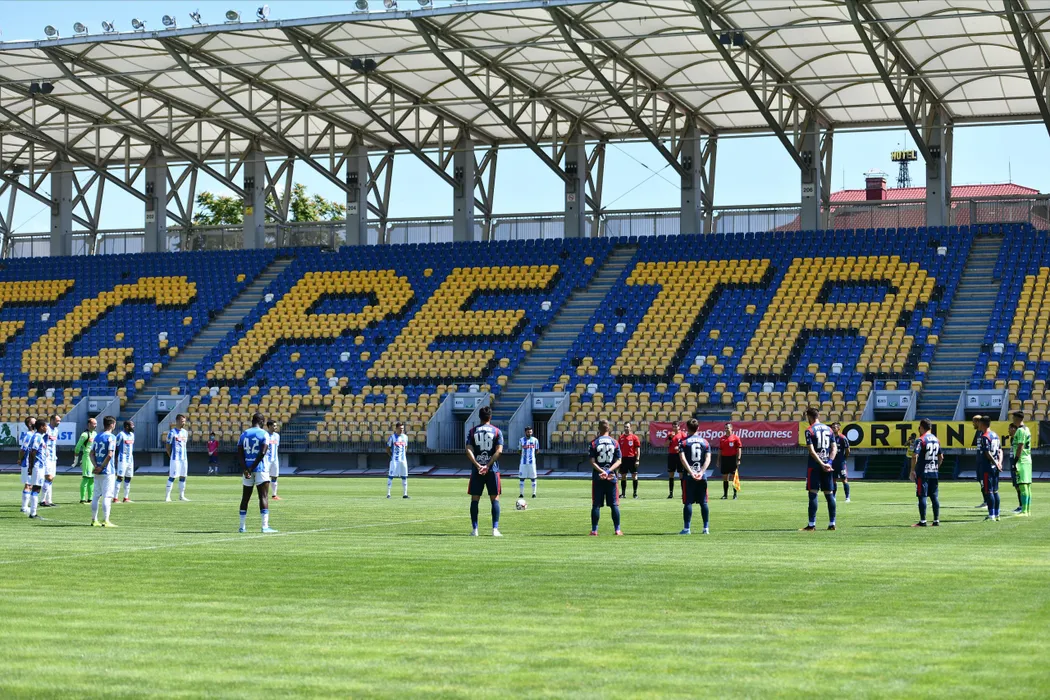 Fotbalistii celor doua echipe pastreaza un minut de reculegere inaintea meciului de fotbal dintre Chindia Targoviste si CSM Politehnica Iasi, contand pentru play-out-ul Ligii 1 Casa Pariurilor, disputat fara spectatori pe Stadionul Ilie Oana din Ploiesti, sambata 27 iunie 2020. © FOTO:Razvan Pasarica/SPORT PICTURES
