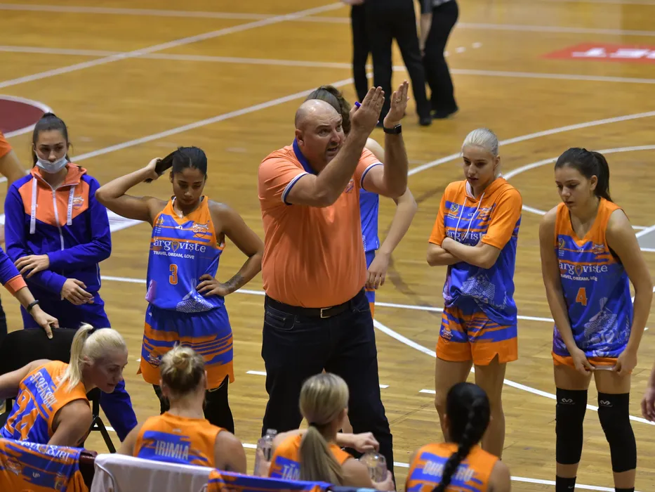 Catalin Tanase alaturi de baschetbalistele targovistene la un timeout luat in meciul de baschet feminin dintre Rapid Bucuresti si CSM Targoviste, contand pentru Liga Nationala, desfasurat in Sala Rapid din Bucuresti, sambata 20 noiembrie 2021. © FOTO:Razvan Pasarica/SPORT PICTURES