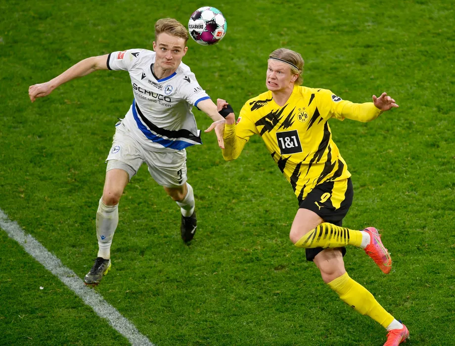 27 February 2021, North Rhine-Westphalia, Dortmund: Football, Bundesliga, Borussia Dortmund - Arminia Bielefeld, Matchday 23, Signal Iduna Park: Bielefeld defender Amos Pieper and Dortmund striker Erling Haaland. IMPORTANT NOTE: In accordance with the regulations of the DFL Deutsche Fußball Liga and the DFB Deutscher Fußball-Bund, it is prohibited to use or have used photographs taken in the stadium and/or of the match in the form of sequence pictures and/or video-like photo series. Photo: Marius Becker/dpa-POOL/dpa,Image: 593932409, License: Rights-managed, Restrictions: GERMANY OUT, Model Release: no