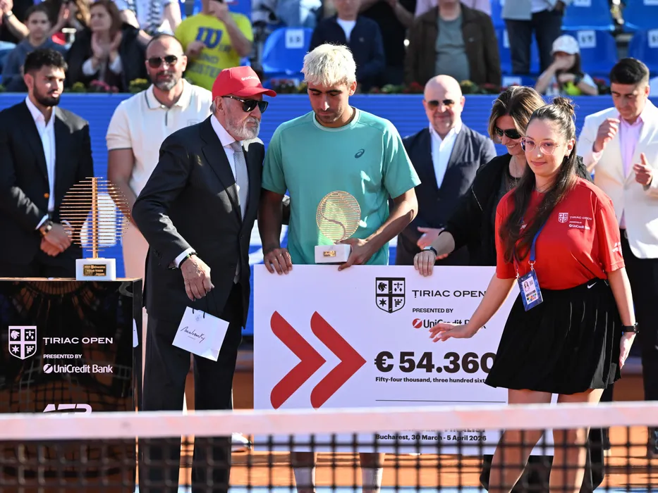 Daniel Merida Aguilar pozeaza alături de trofeu si Ilie Nastase dupa meciul de tenis masculin pierdut impotriva lui Mariano Navone, finala de simplu ATP Tiriac Open 2026, desfasurat la Centrul National de Tenis Simona Halep din Bucuresti, duminica 5 aprilie 2026. © FOTO:Razvan Pasarica/SPORT PICTURES
