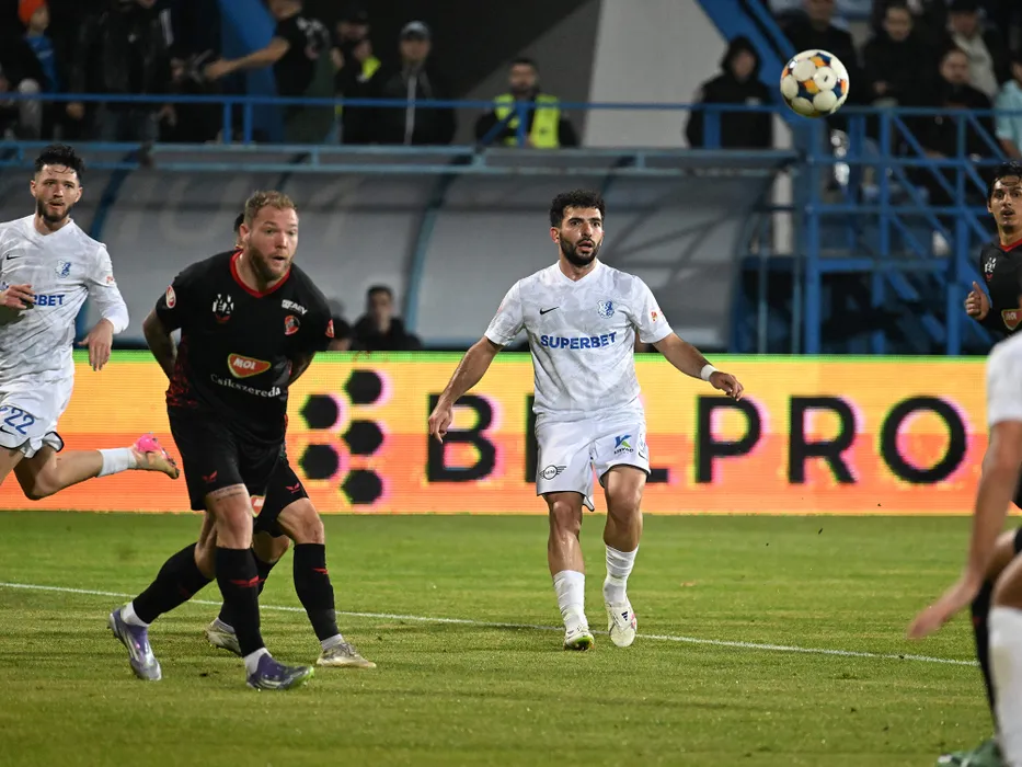 Dan Sîrbu si Narek Grigoryan in meciul de fotbal dintre Farul Constanta si FK Csikszereda Miercurea Ciuc, contand pentru Superliga Superbet, desfasurat pe Stadionul central al Academiei Gheorghe Hagi din Ovidiu, luni 3 noiembrie 2025. © FOTO:Razvan Pasarica/SPORT PICTURES