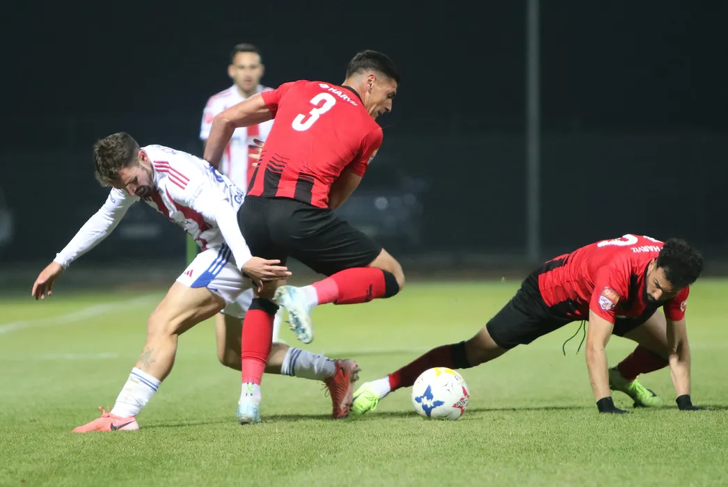 Joao Pedro Santos Lameira și Raul Palmeș, Soufiane Jebari în meciul de fotbal dintre AFK Csikszereda Miercurea Ciuc și SC Oțelul Galați, contând pentru Cupa României Betano, desfășurat pe Stadionul Municipal din Miercurea Ciuc, miercuri 30 octombrie 2024. © FOTO: Valentin MUNTEANU/SPORT PICTURES