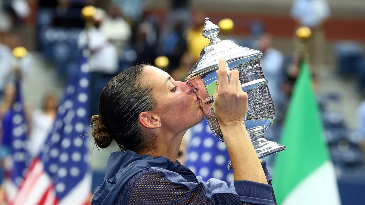 September 12, 2015 - Flavia Pennetta celebrates with the trophy after defeating Roberta Vinci (not pictured) in a women's singles final match during the 2015 US Open at the USTA Billie Jean King National Tennis Center in Flushing, NY. (USTA/Ned Dishman)