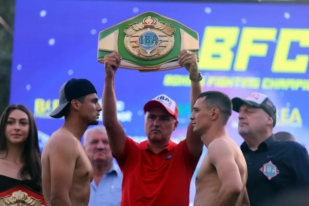 Flavius Biea (D) si Ivan Alvarez participa la proba cantarului oficial, inaintea meciului din cadrul Galei profesioniste "Boxing Fighting Championship", joi, 29 iulie 2021, la Timisoara. EMANUEL TITUS ILIESI / MEDIAFAX FOTO