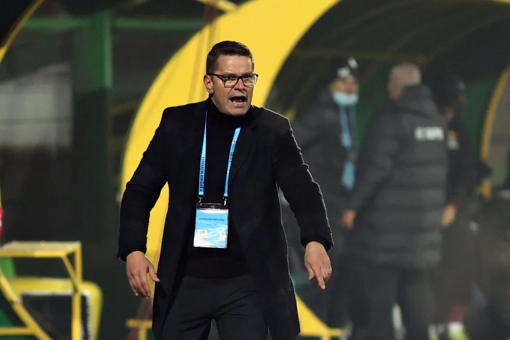 Flavius Stoican, antrenorul echipei FCU Craiova, urmareste meciul de fotbal contra formatiei Rapid din etapa a XIV-a a Ligii 1, disputat pe stadionul Orasenesc din Mioveni, luni, 1 noiembrie 2021. GEORGE FILIP / MEDIAFAX FOTO
