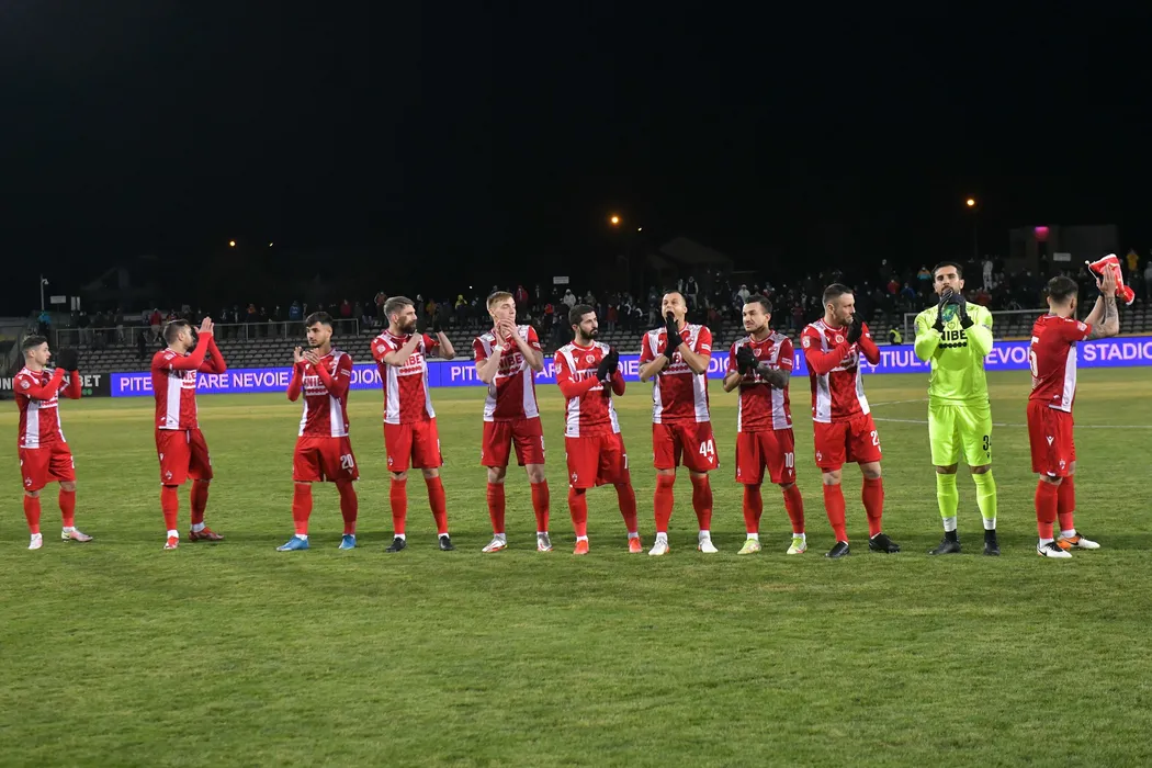 Fotbalistii dinamovisti la startul meciului de fotbal dintre FC Arges si Dinamo Bucuresti, contand pentru Liga 1 Casa Pariurilor, desfasurat pe Stadionul Nicolae Dobrin din Pitesti, vineri 21 ianuarie 2022. © FOTO:Razvan Pasarica/SPORT PICTURES