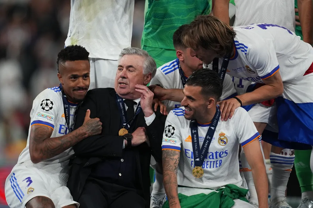 Eder Gabriel Militao of Real Madrid jokes with Real Madrid head coach Carlo Ancelotti during the UEFA Champions League Final match between Liverpool FC and Real Madrid played at Stade de France on May 28, 2022 in Paris, France.,Image: 695865494, License: Rights-managed, Restrictions: *** World Rights Except Japan, Spain, France and The Netherlands ***, Model Release: no