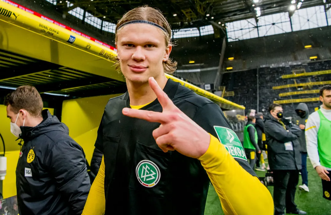 DORTMUND, GERMANY - MAY 22: Erling Haaland of Borussia Dortmund with the jersey of head referee Manuel Gräfe after his final whistle during the Bundesliga match between Borussia Dortmund and Bayer 04 Leverkusen at the Signal Iduna Park on May 22, 2021 in Dortmund, Germany. (Photo by Alexandre Simoes/Borussia Dortmund via Getty Images)