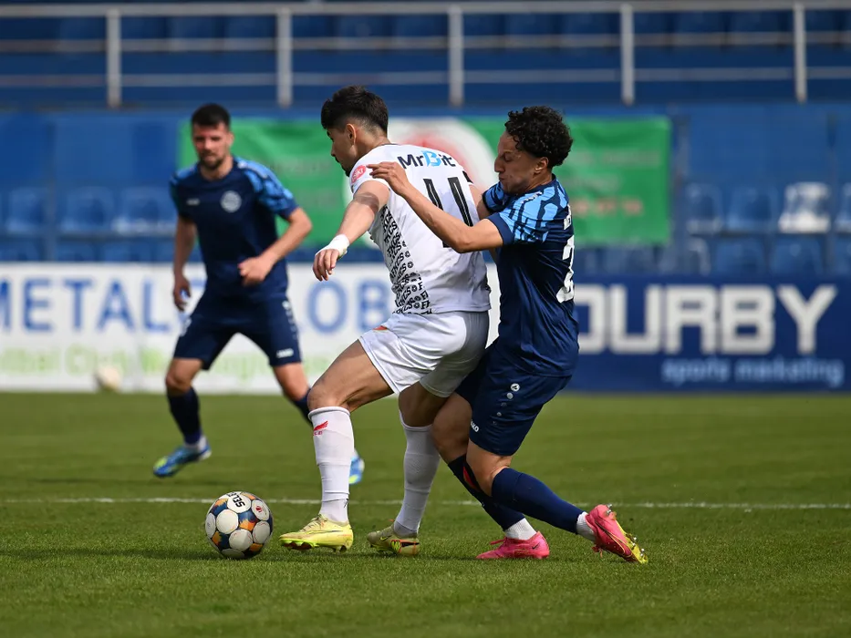 Francisco Anderson De Jesus Dos Santos si Yassine Mohammed Zakir in meciul de fotbal dintre Metaloglobus Bucuresti si FK Csikszereda Miercurea Ciuc, contand pentru Play out-ul Superligii Superbet, desfasurat pe Clinceni Arena din Clinceni, luni 13 aprilie 2026. © FOTO:Razvan Pasarica/SPORT PICTURES