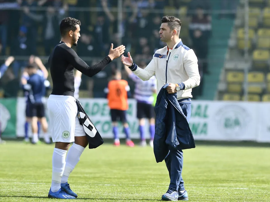Florin Bratu isi saluta un fotbalist dupa meciul de fotbal dintre Concordia Chiajna si ACS ASU Politehnica Timisoara, contand pentru Liga a-2-a Casa Pariurilor, disputat pe Stadionul comunal Concordia din Chiajna, sambata 7 martie 2019. © FOTO:Razvan Pasarica/SPORT PICTURES