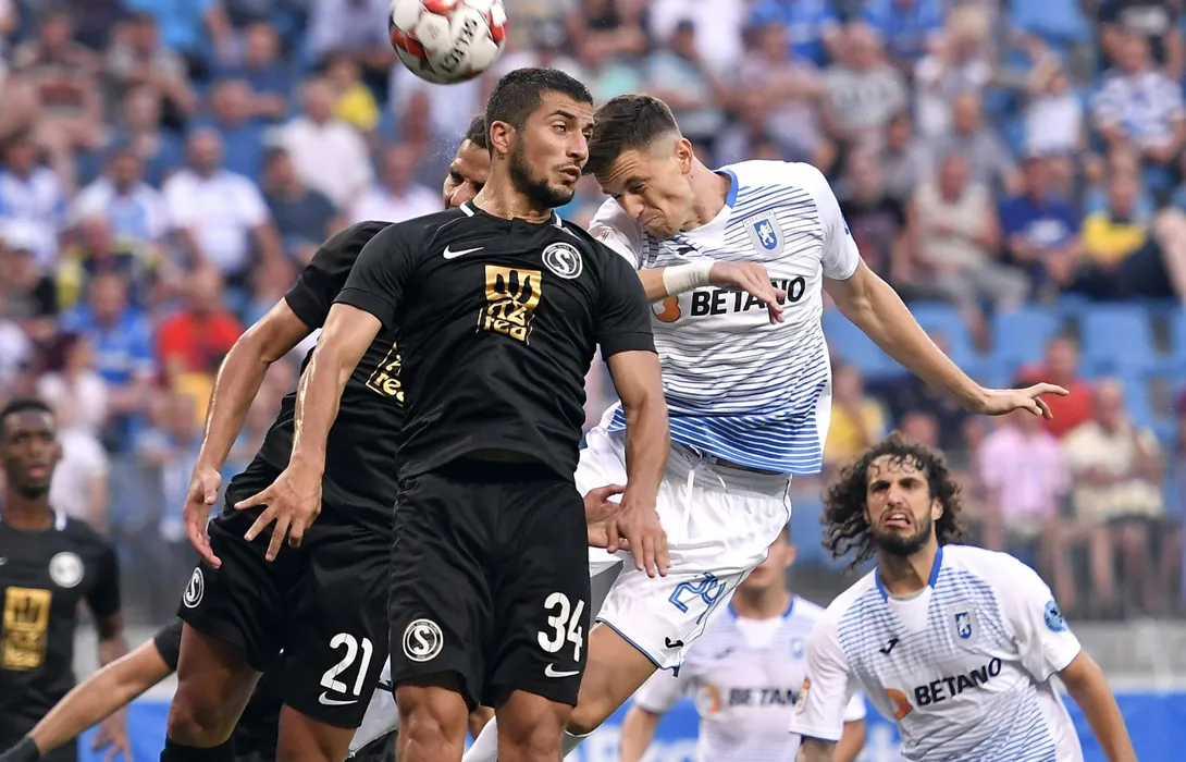 Florin Gardos si Tiago Ferreira in meciul de fotbal dintre Universitatea Craiova si Sabail FK din cadrul Preliminariilor Ligii Europa, desfasurat pe Stadionul Ion Oblemenco din Craiova, joi 18 iulie 2019. © FOTO:Razvan Pasarica/SPORT PICTURES