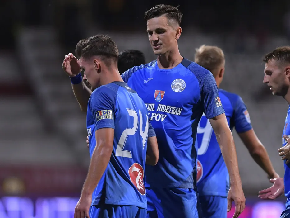Florin Gardos il felicita pe Marius Iulian Cioiu dupa un gol marcat in meciul de fotbal dintre Dinamo Bucuresti si Academica Clinceni, contand pentru Liga 1 Casa Pariurilor, desfasurat pe Stadionul Dinamo din Bucuresti, luni 2 august 2021. © FOTO:Razvan Pasarica/SPORT PICTURES