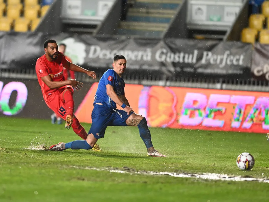 Abdel Slem Billel Omrani marcheaza un gol de langa Daniel Marinel Celea in meciul de fotbal dintre Chindia Targoviste si FCSB, contand pentru Superliga Superbet, desfasurat pe Stadionul Ilie Oana din Ploiesti, duminica 11 decembrie 2022. © FOTO:Razvan Pasarica/SPORT PICTURES