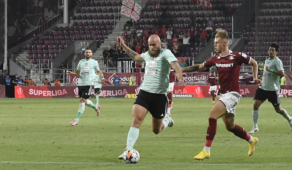 Branislav Ninaj și Timotej Jambor în meciul de fotbal dintre FC Rapid 1923 București și Sepsi OSK Sfântu Gheorghe, contând pentru Superliga Superbet, desfășurat pe Stadionul Superbet Arena - Giulești din București, luni 5 august 2024. © FOTO: Simion MECHNO/SPORT PICTURES