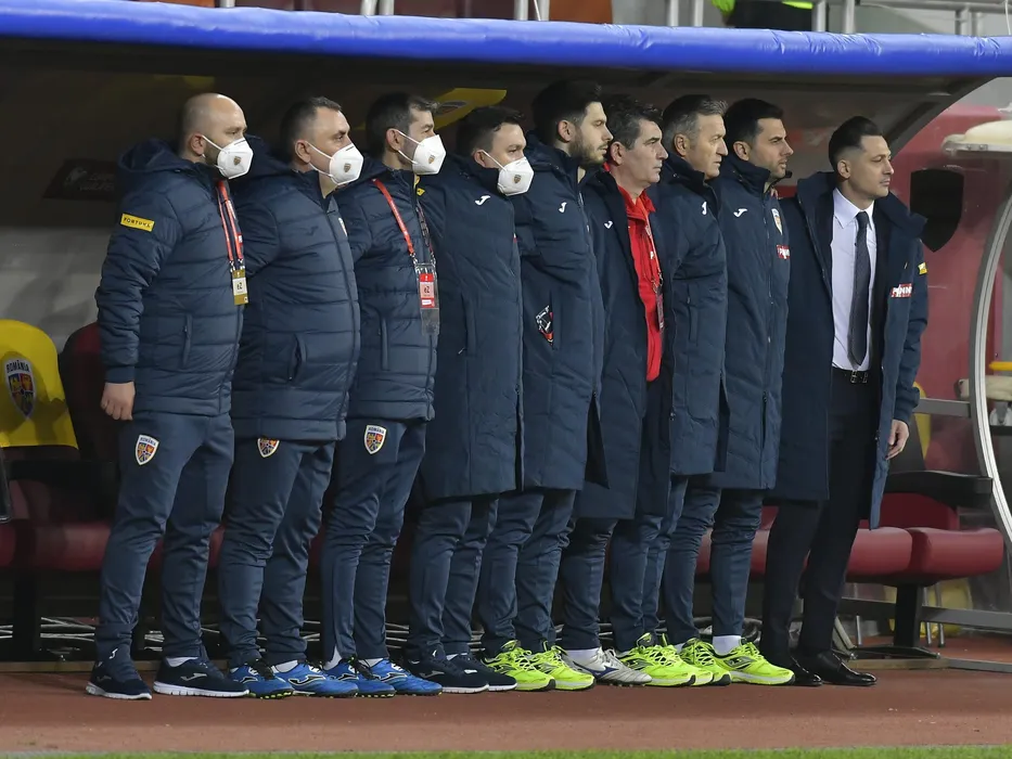 Banca Romaniei cu Mirel Radoi, Florin Constantinovici si Nicolae Dica in meciul de fotbal dintre Romania si Macedonia de Nord, din cadrul Preliminariilor Campionatului Mondial 2022, desfasurat fara spectatori pe Arena Nationala din Bucuresti, joi 25 martie 2021. © FOTO:Razvan Pasarica/SPORT PICTURES