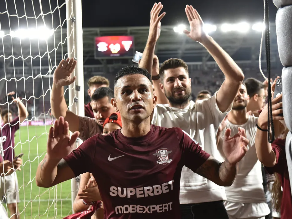 Morais Junior Iraneuton Sousa si Florin Bogdan Stefan saluta galeria dupa meciul de fotbal dintre Rapid Bucuresti si UTA Arad, contand pentru Superliga Superbet, desfasurat pe Stadionul Rapid Giulesti din Bucuresti, sambata 20 august 2022. © FOTO:Razvan Pasarica/SPORT PICTURES