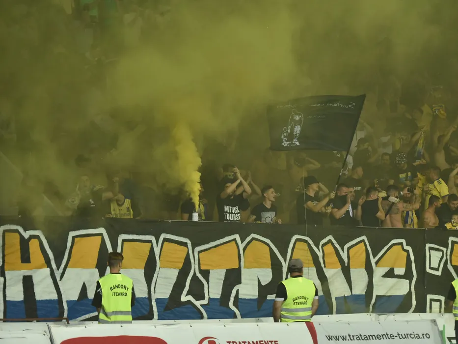 Fumigene si torte in peluza petrolista la meciul de fotbal dintre Petrolul Ploiesti si Rapid Bucuresti, contand pentru Superliga Superbet, desfasurat pe Stadionul Ilie Oana din Ploiesti, sambata 13 august 2022. © FOTO:Razvan Pasarica/SPORT PICTURES