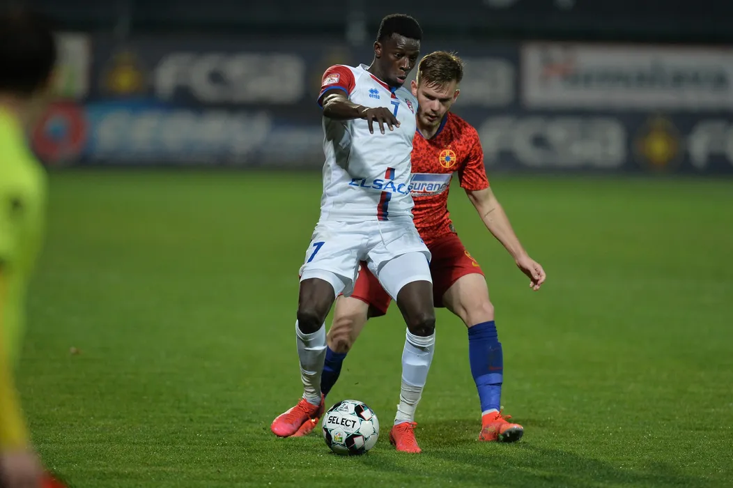 Adrian Sut (S), de la FC Botosani, suteaza in timpul meciului de fotbal contra echipei FCSB din prima etapa a play-off-ului Ligii 1, disputat pe stadionul Marin Anastasovici din Giurgiu, duminica, 18 aprilie 2021. EDUARD VINATORU / MEDIAFAX FOTO