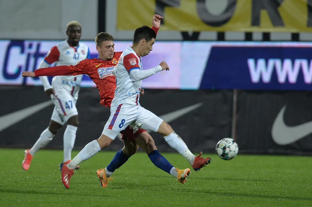 Jonathan Rodriguez (D), de la FC Botosani, suteaza in timpul meciului de fotbal contra echipei FCSB din prima etapa a play-off-ului Ligii 1, disputat pe stadionul Marin Anastasovici din Giurgiu, duminica, 18 aprilie 2021. EDUARD VINATORU / MEDIAFAX FOTO