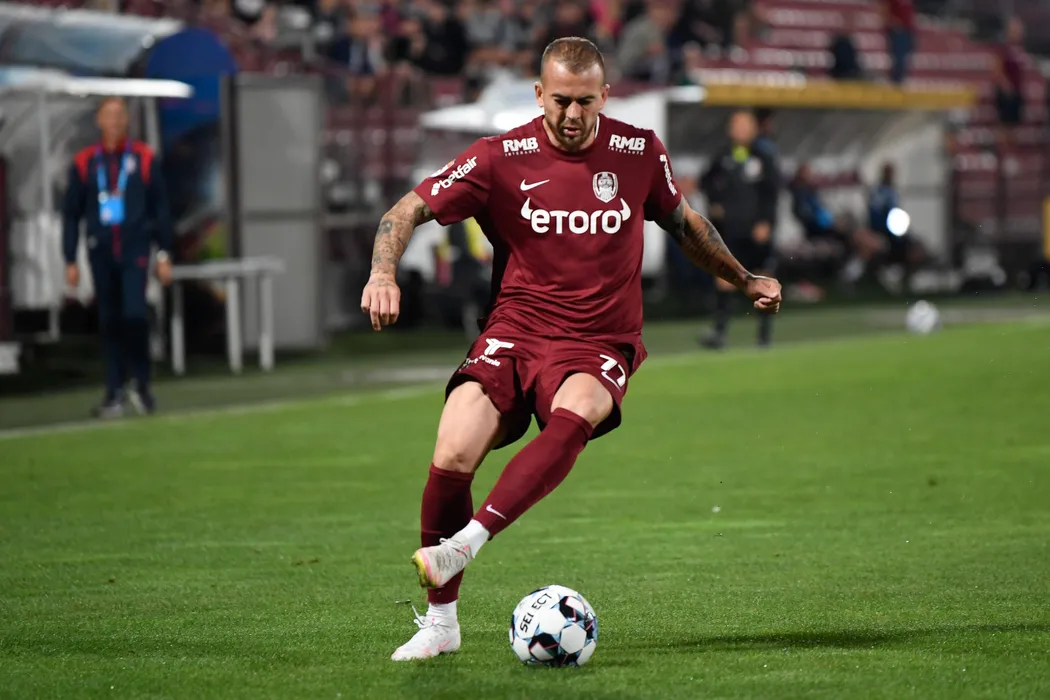 Denis Alibec, de la CFR Cluj, suteaza in timpul meciului de fotbal contra echipei Chindia Targoviste din etapa a III-a a Ligii 1, disputat pe stadionul Dr. Constantin Radulescu din Cluj-Napoca, sambata, 31 iulie 2021. FLAVIU BUBOI / MEDIAFAX FOTO