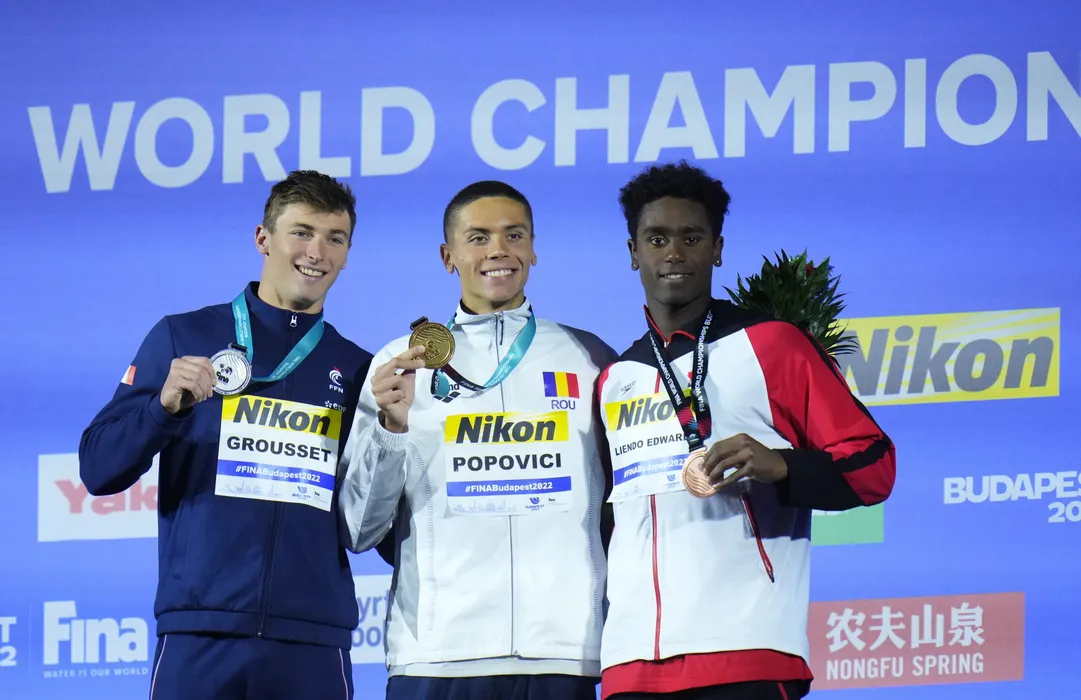 Silver medalist Maxime Grousset of France, left, gold medalist David Popovici of Romania, centre, bronze medalist Joshua Liendo Edwards of Canada, right, pose with their medals after the Men 100m Freestyle final at the 19th FINA World Championships in Budapest, Hungary, Wednesday, June 22, 2022. (AP Photo/Petr David Josek)